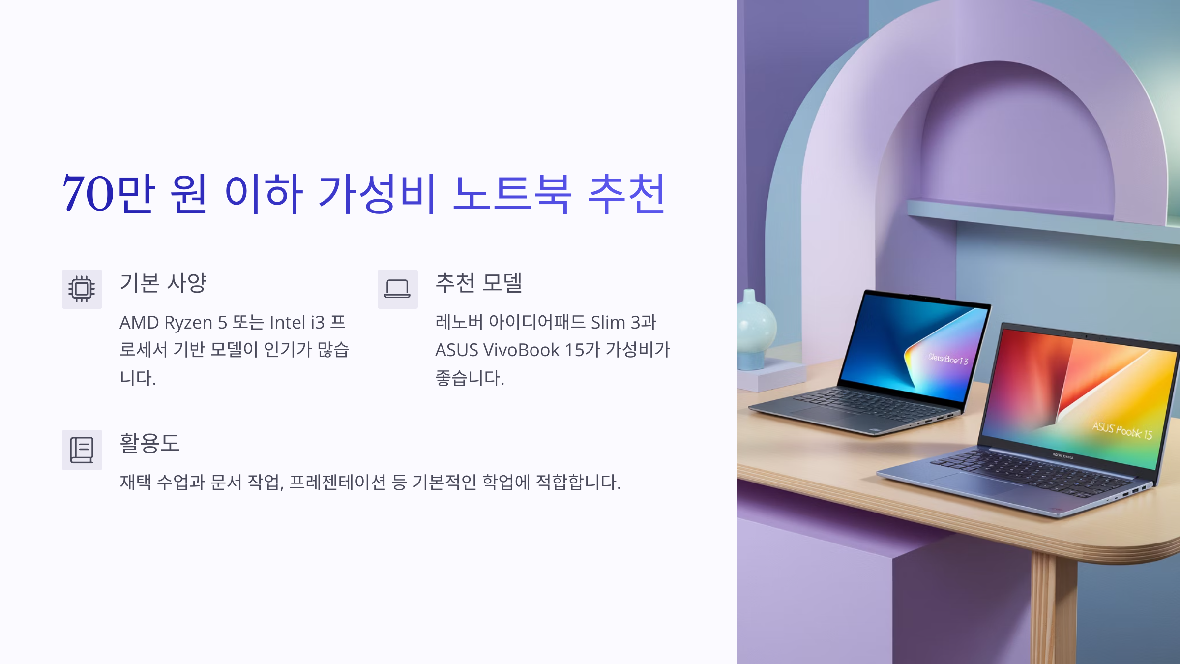 예산이 70만 원 이하라면 '문서 작성, 강의 듣기, 인터넷 서핑' 정도를 깔끔하게 소화할 수 있는 노트북을 골라야 해요. 🎯