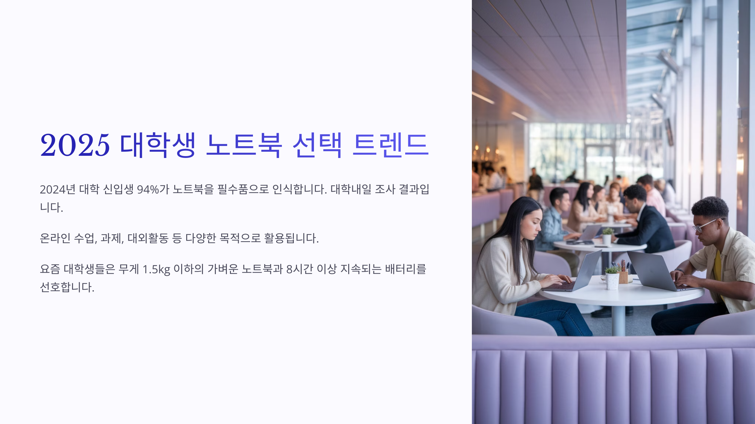 2025년 대학생들이 선호하는 노트북 트렌드는 '가벼움', '긴 배터리 수명', '빠른 속도' 세 가지로 요약할 수 있어요! 📚