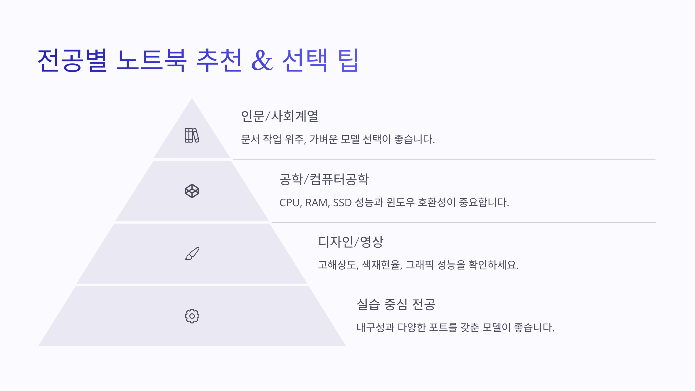 전공에 따라 필요한 노트북 성능은 완전히 달라요. 내 전공에 맞는 노트북을 골라야 진짜 만족스럽게 쓸 수 있어요! 🎓
