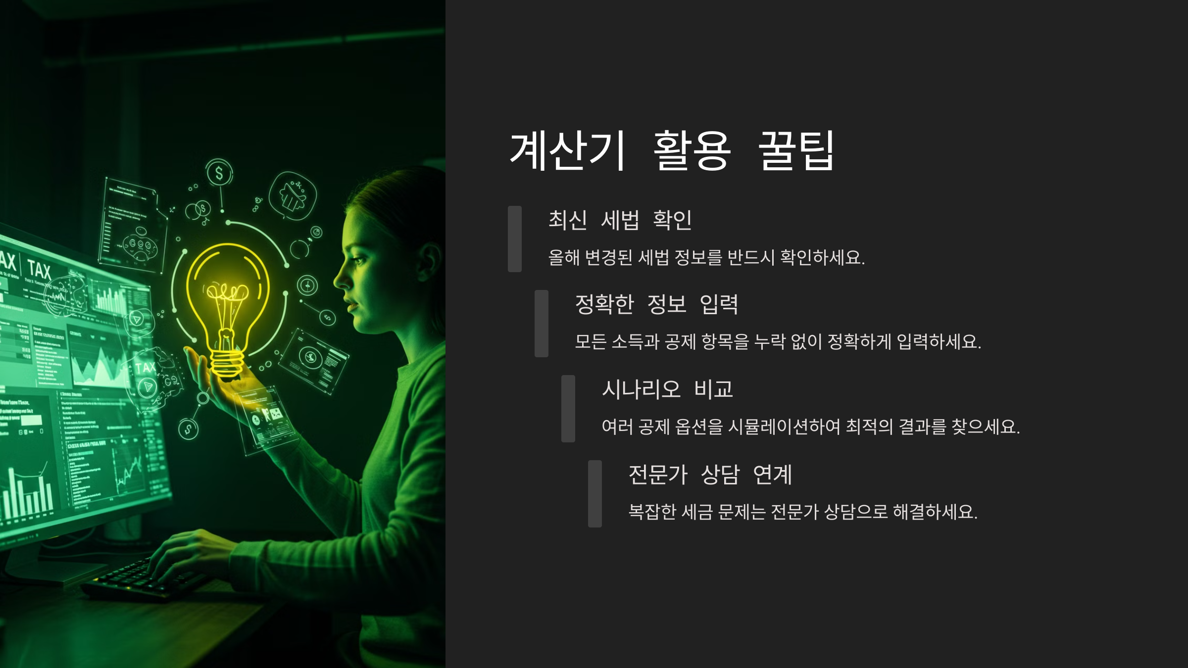 계산기를 통해 이 복잡한 절차를 클릭 몇 번으로 처리할 수 있으니, 미리 사용해보면 실수 없이 연말정산도 준비할 수 있어요!
