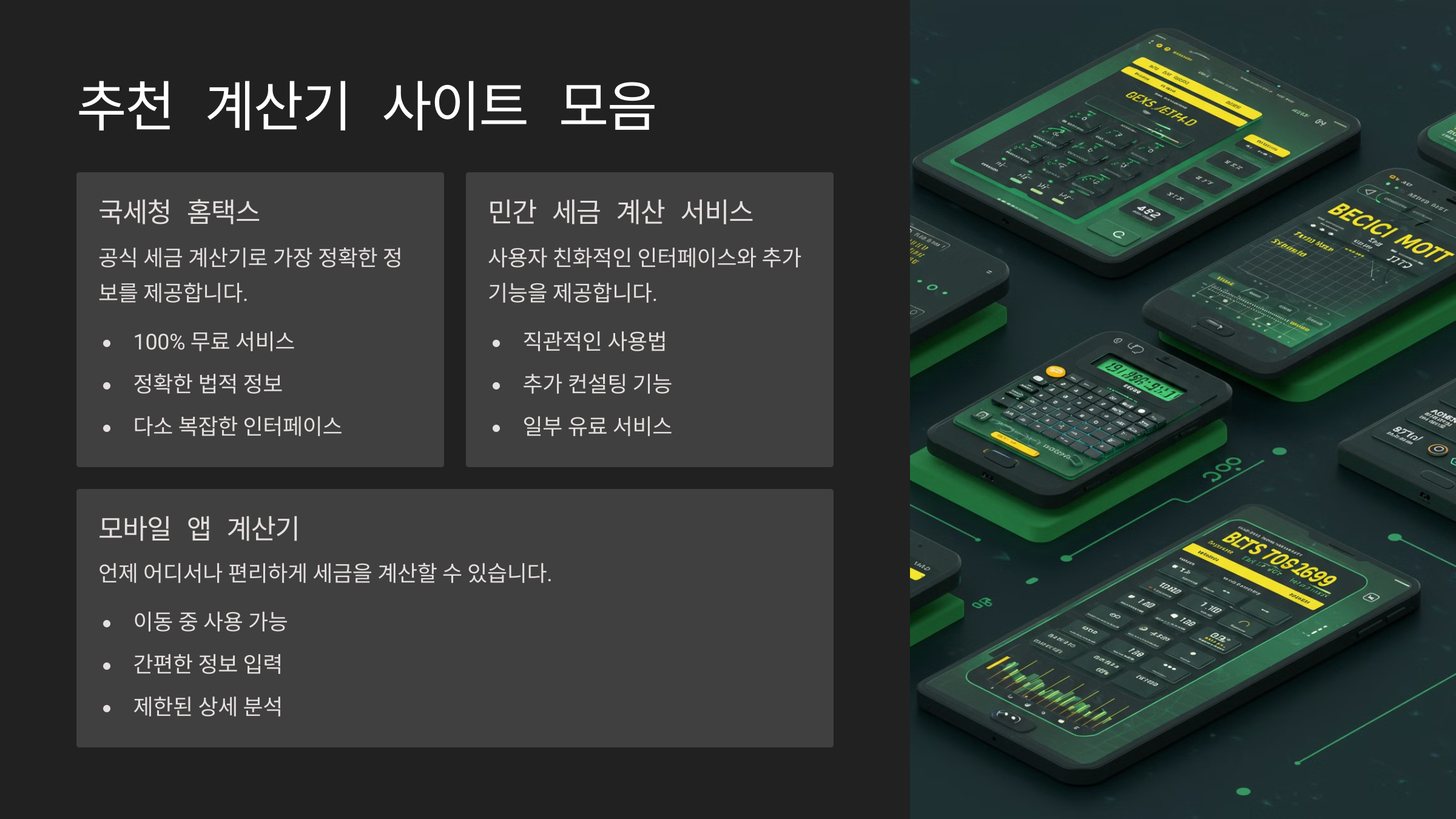 국세청 공식 계산기는 가장 정확하며, 금융기관이나 민간 서비스는 사용자 편의성이 뛰어나요. 상황에 따라 병행해서 활용하면 더 좋아요.