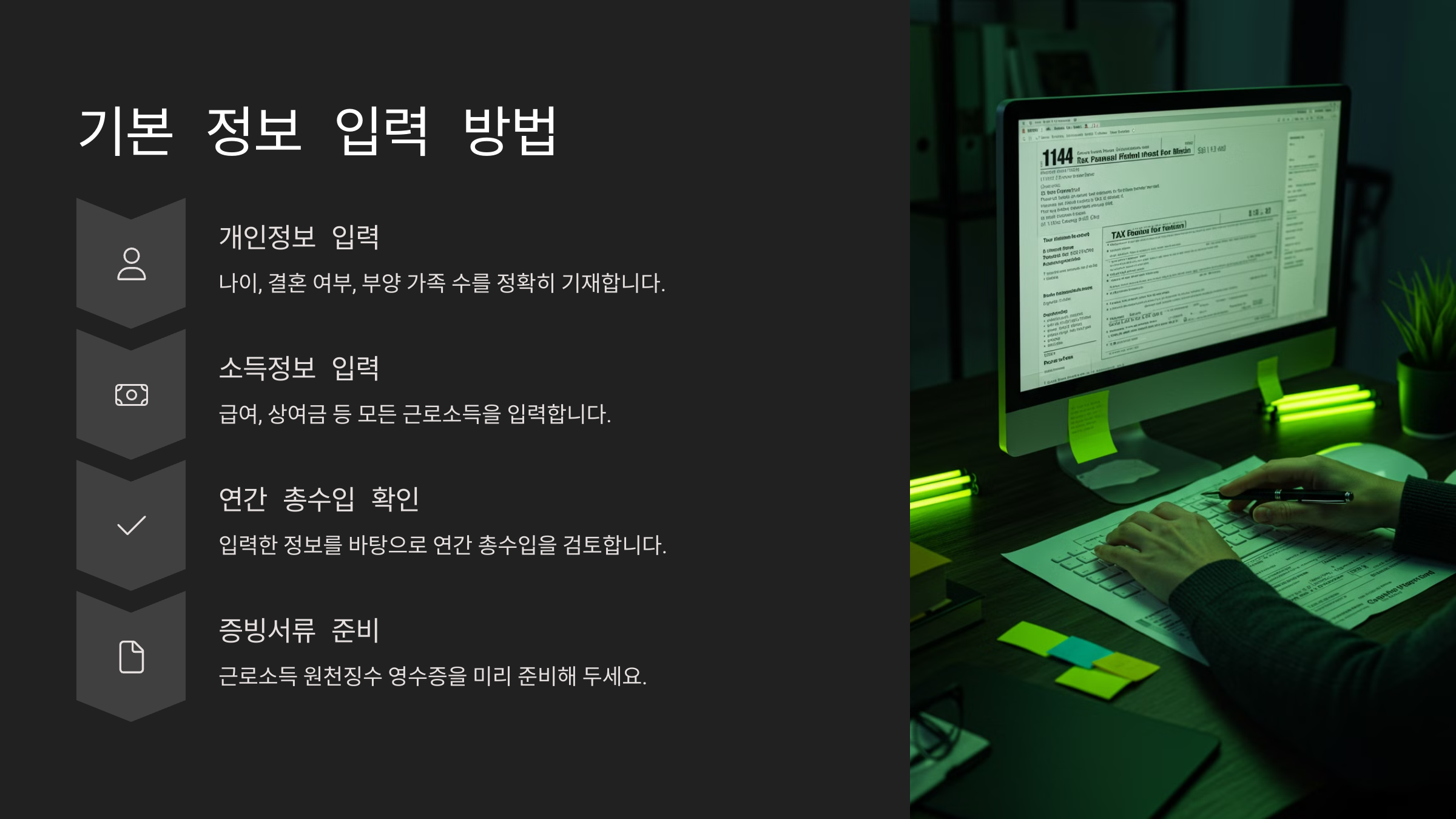 또한 인적공제 정보도 꼭 입력해야 해요. 본인 외에도 배우자, 자녀, 부모님 등 부양가족이 있으면 기본공제 대상자 수에 따라 세금이 달라져요. 이를 통해 총소득에서 공제되는 금액이 달라지니까요.
