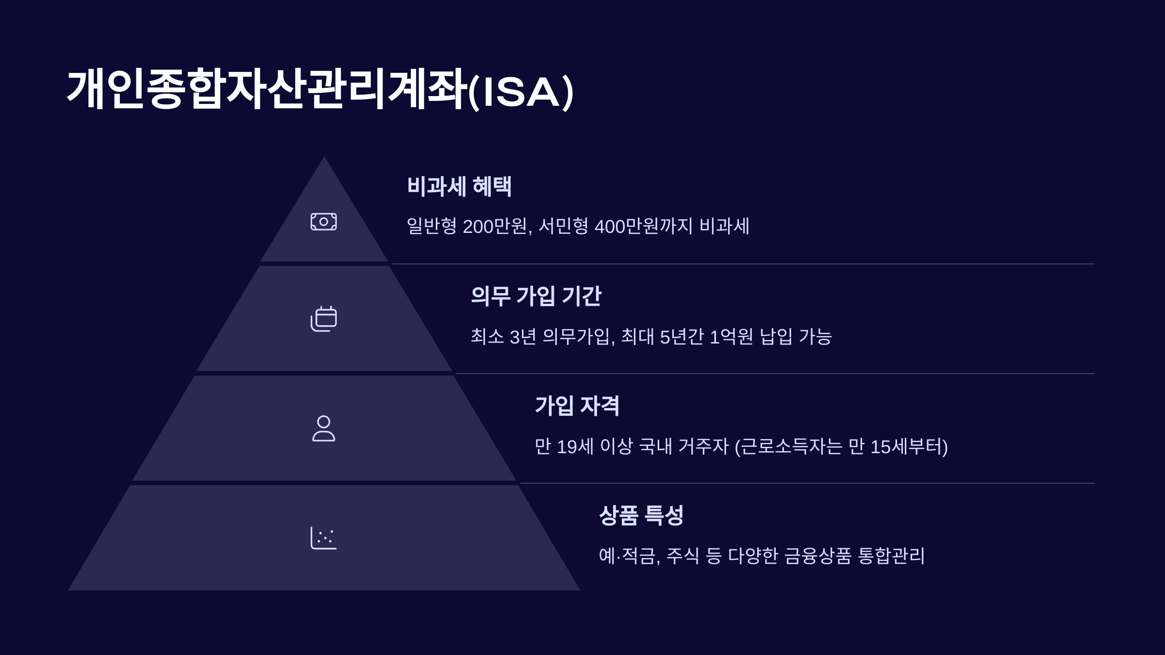 | ISA | 비과세+저율분리과세 | 전 국민 | 다양한 상품 통합관리 |