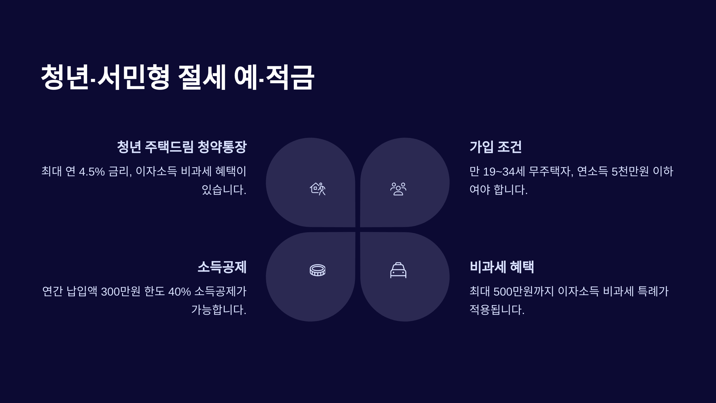 | 청년도약계좌 | 19~34세, 연소득 7,500만 원 이하 | 이자소득세 면제 + 정부지원금 |