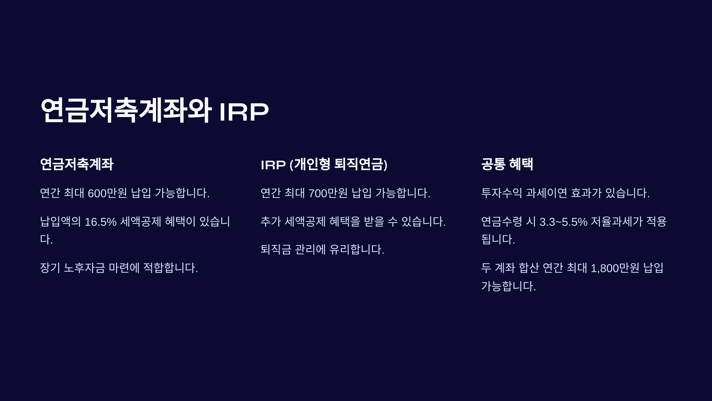 연금저축과 IRP는 '세액공제'와 '과세이연'이라는 강력한 절세 혜택을 주는 대표적인 노후 준비형 계좌예요. 노후를 위한 자산을 쌓으면서도 매년 세금 혜택을 받을 수 있어, 특히 직장인과 자영업자들에게 인기가 많아요.