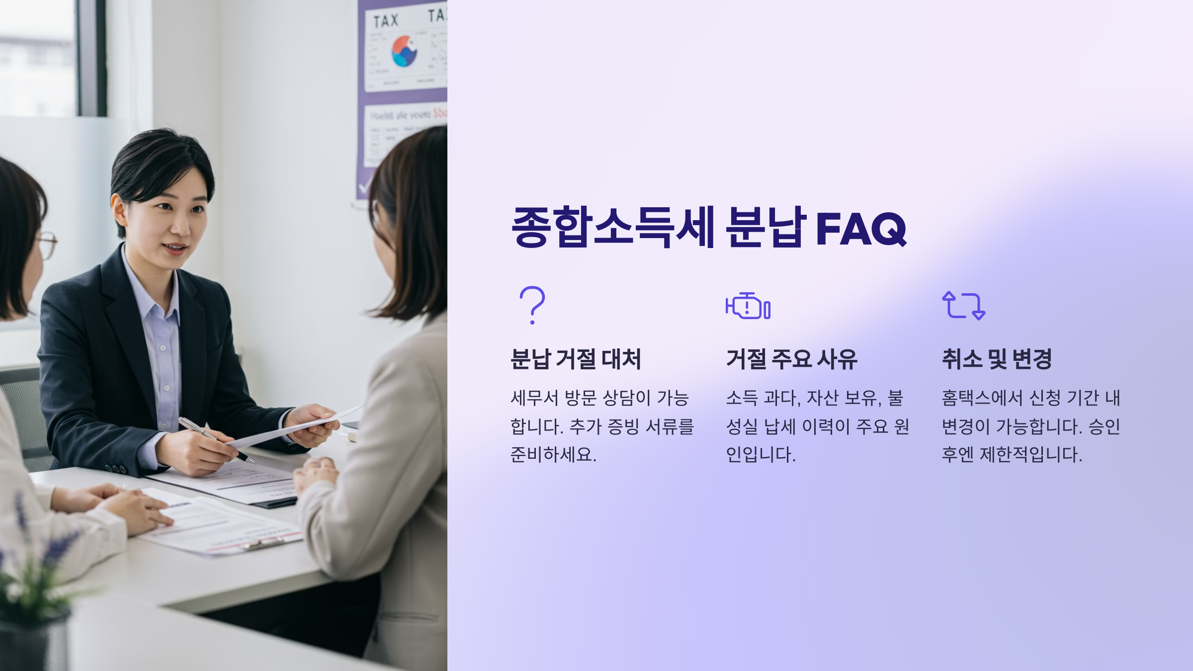 만약 이때 내야 할 세금이 많다면, 국세청에서 허용하는 조건에 따라 '분할 납부'를 신청할 수 있어요. 바로 오늘의 주제인 종합소득세 분납이에요! 😎