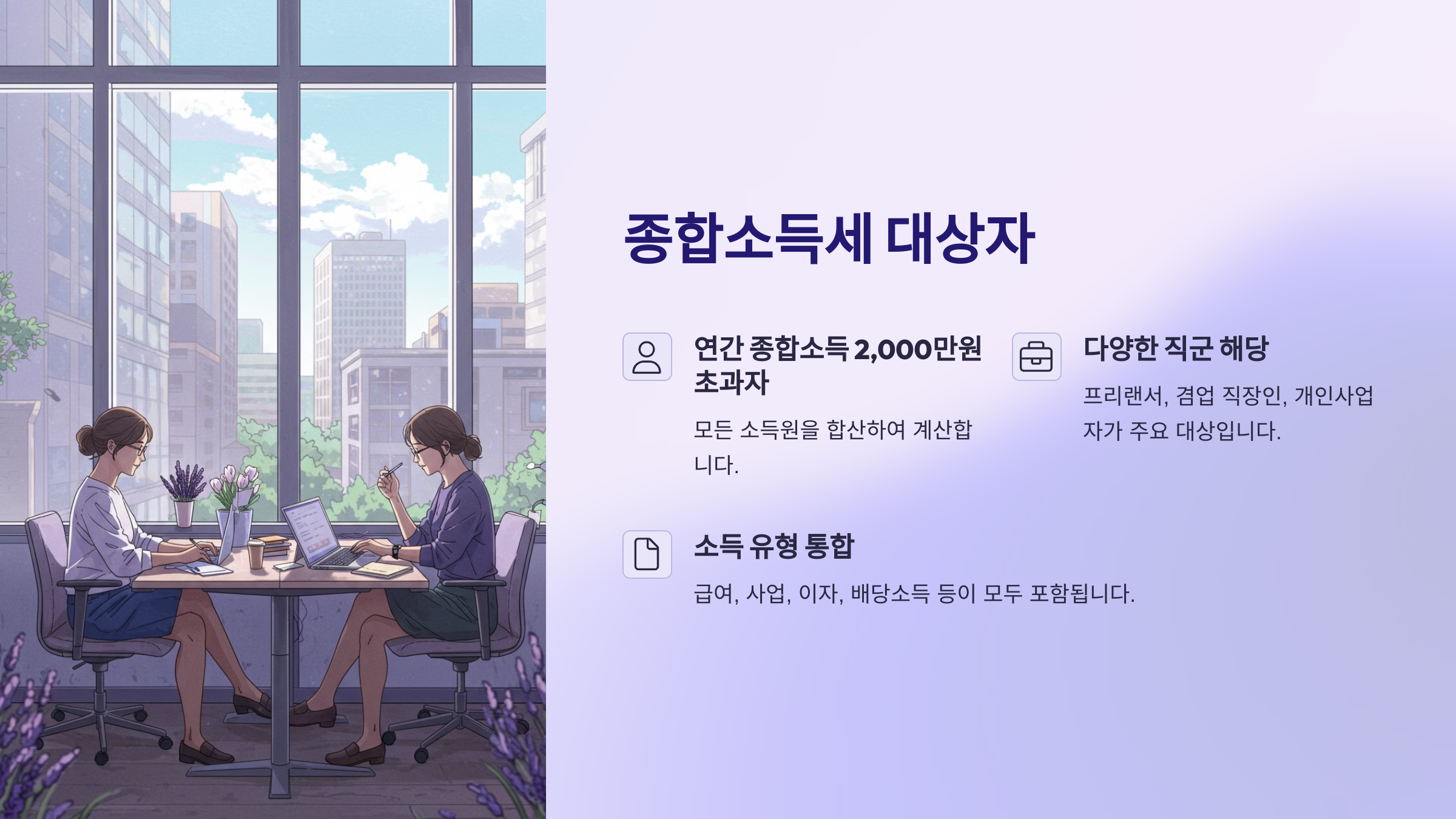 종합소득세는 개인이 벌어들인 다양한 소득을 합산해서 신고하고 납부하는 세금이에요. 직장인이 아니더라도 프리랜서, 사업자, 유튜버, 투잡러 등 다양한 사람들에게 해당되는 중요한 세금이죠.