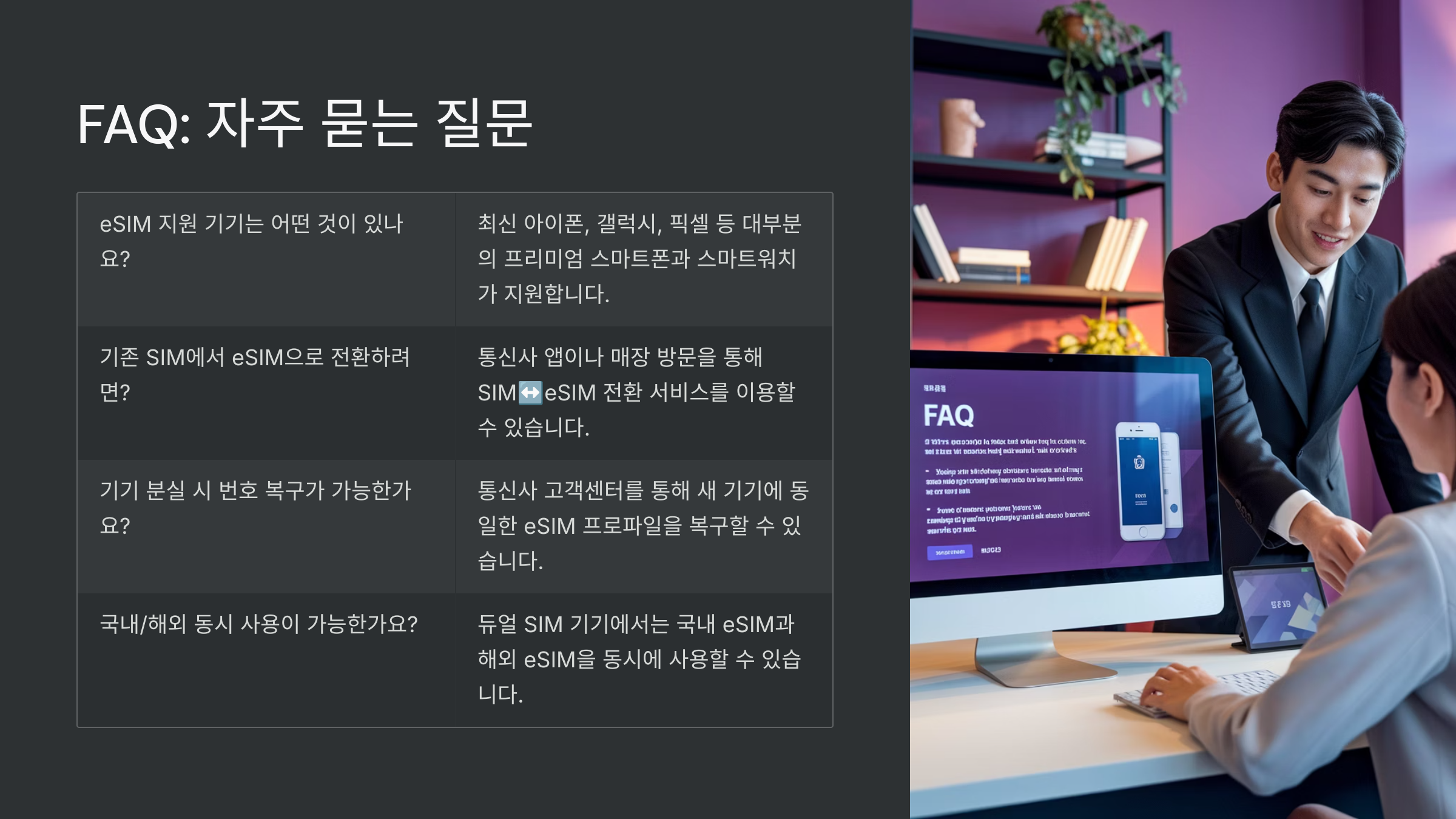 A5. 네! 듀얼 SIM 기능으로 하나는 물리 SIM, 다른 하나는 eSIM으로 동시에 사용할 수 있어요. 👍